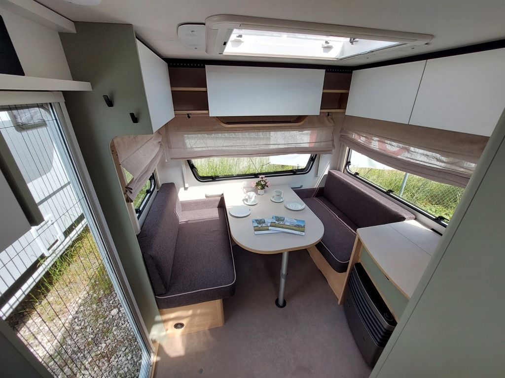 Vorzeltleuchte LED, Deichselabdeckung, Reserveradhalterung im Flaschenkasten, Fliegenschutztür, LED-Ambientebeleuchtung, Therme für Warmwasserversorgung, Umluftanlage 230 V, Eingangstür, Abwassertank 25 l rollbar, Frischwassertankanzeige, 2x USB-Steckdose für Stromschiene, Dachverstärkung Klimaanlage, Stützrad mit Stützlastanzeige, Stabilformstützen inkl. Tellerfüßen, Dachhaube